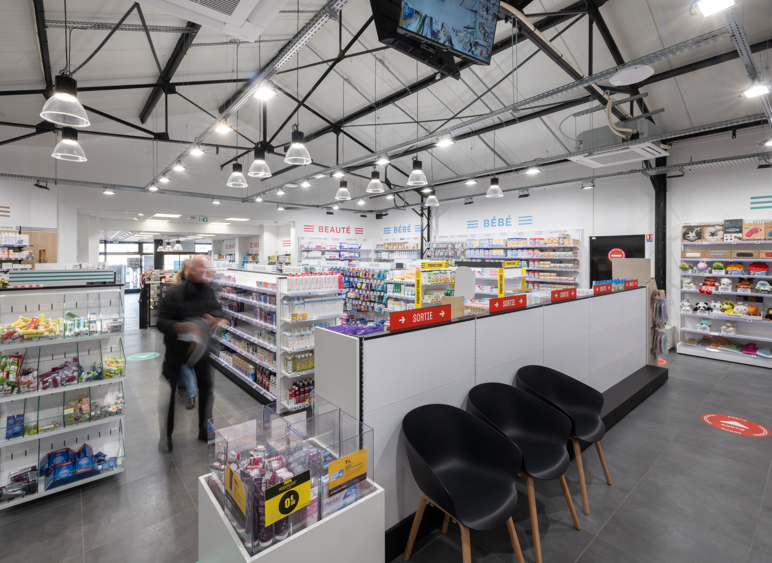L’un des enjeux majeurs de ce projet résidait dans la réhabilitation de bâtiments aux usages et structures différents. La charpente industrielle a été conservée et valorisée, offrant aujourd’hui un caractère distinctif à l’officine. Ce choix a permis d’allier esthétisme et fonctionnalité.