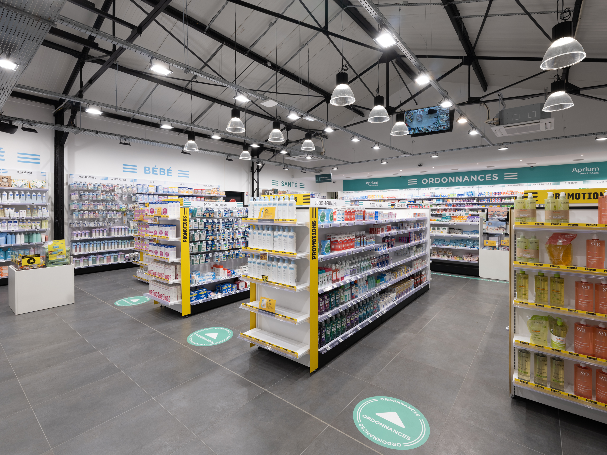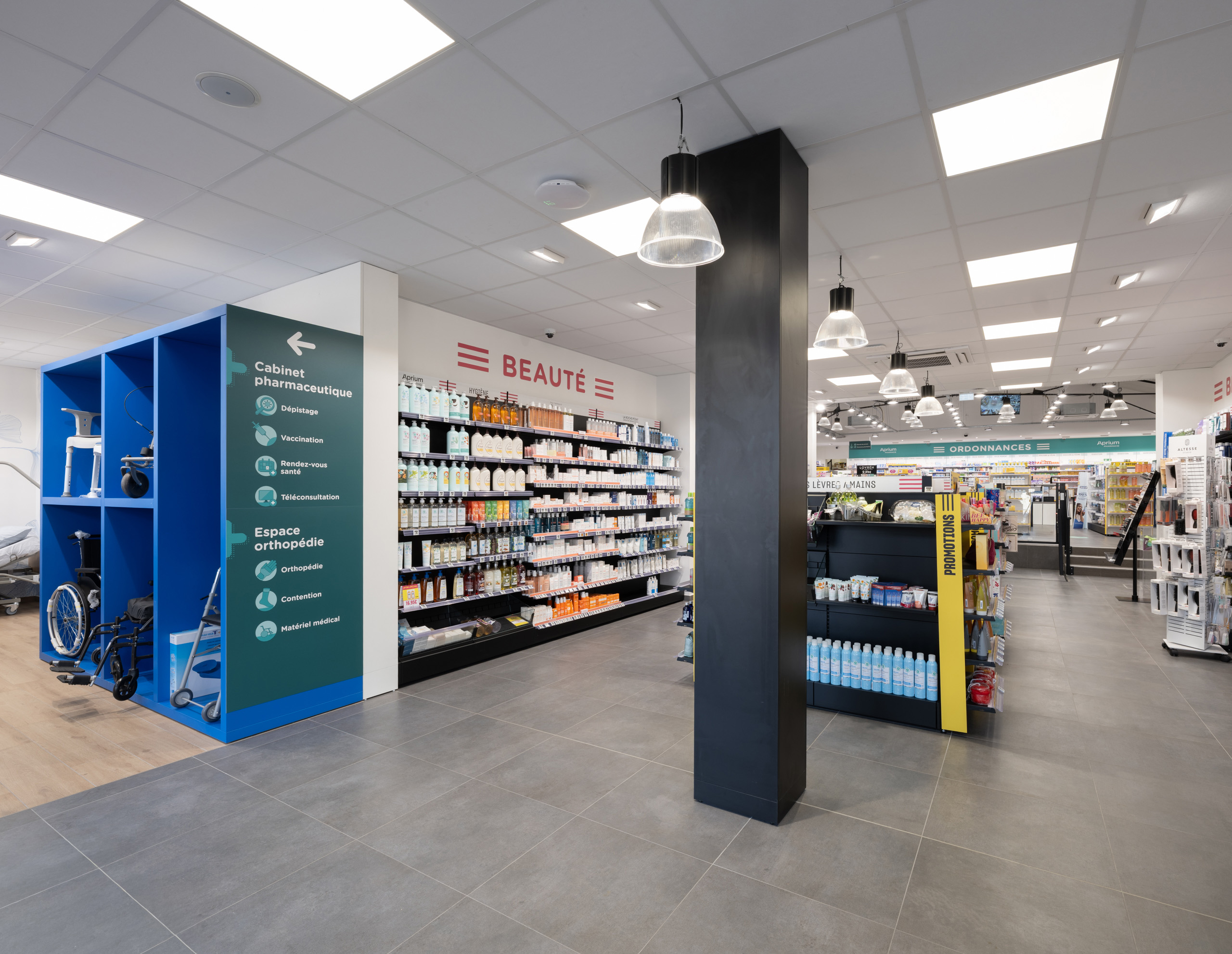 La nouvelle pharmacie affiche aujourd’hui une identité forte avec mise au concept Aprium. L’agencement de la pharmacie a été conçu pour renforcer cette image de modernité et d’expertise, tout en s’insérant harmonieusement dans le tissu local.